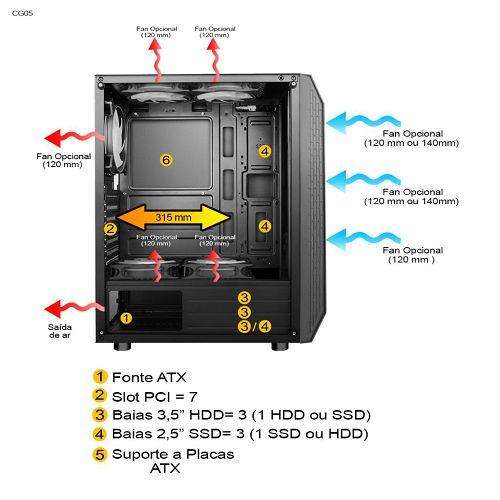 | QUANTIDADE DE COOLERS SUPORTADOS | Frontal: 3x120mm ou 2x140mm / Traseira: 1x120mm / Teto: 2x120mm / Inferior: 2x120mm |