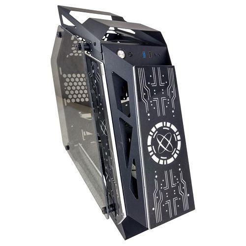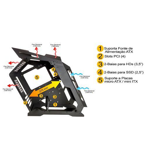 Gabinete Gamer Micro ATX com Design inovador estilo CaseMod suporta Fonte na Base Central e lateral de Vidro