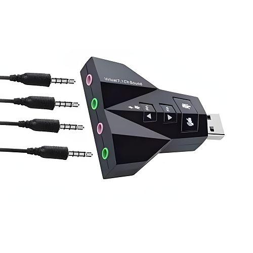 Placa de som USB, utilizada para substituir ou agregar mais uma placa de som ao seu computador ou/e notebook. Muito utilizado por iniciantes em mixagem de músicas e edições sonoras. Muito mais prática que uma placa de som PCI. Não necessida de alimentação externa, com saída stereo. Microfone mono-jack de entrada.
